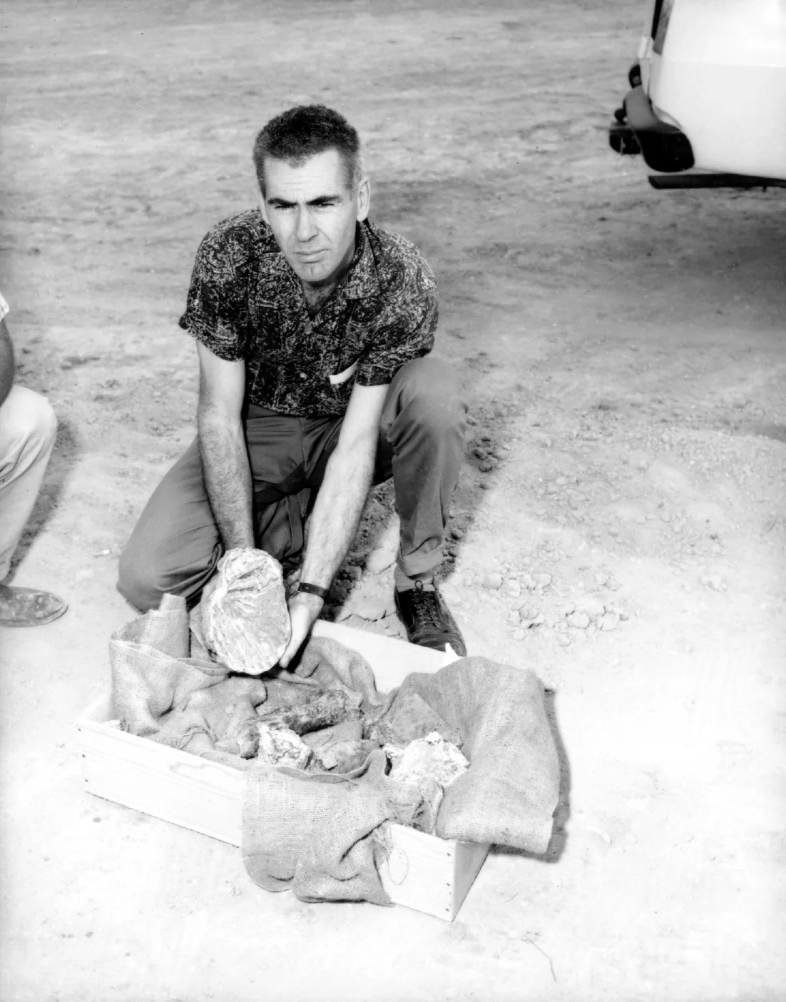 This photo was taken during excavation of fossil mammoth bones on the Radioplane site in Rancho Conejo, in 1961. Leonard Bessom, a paleontologist with the LA Co. Museum of Natural History is the man handling the fossils in the photo.